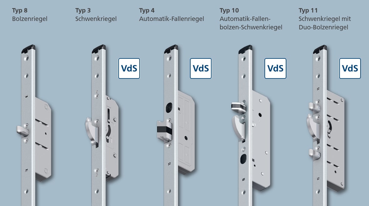 Als Spezialist für moderne Sicherungssysteme bieten wir Lösungen für jede erdenkliche Anforderung. Dafür stehen Ihnen effektive und bewährte Komponenten zur Verfügung. Sie können für den Einsatz bei Aluminium- und Stahltüren aus einer breiten Palette an Schlossvarianten wählen. Die zuverlässige Sicherheit der Verriegelungen wird u. a. durch die VdS-Anerkennung dokumentiert.
