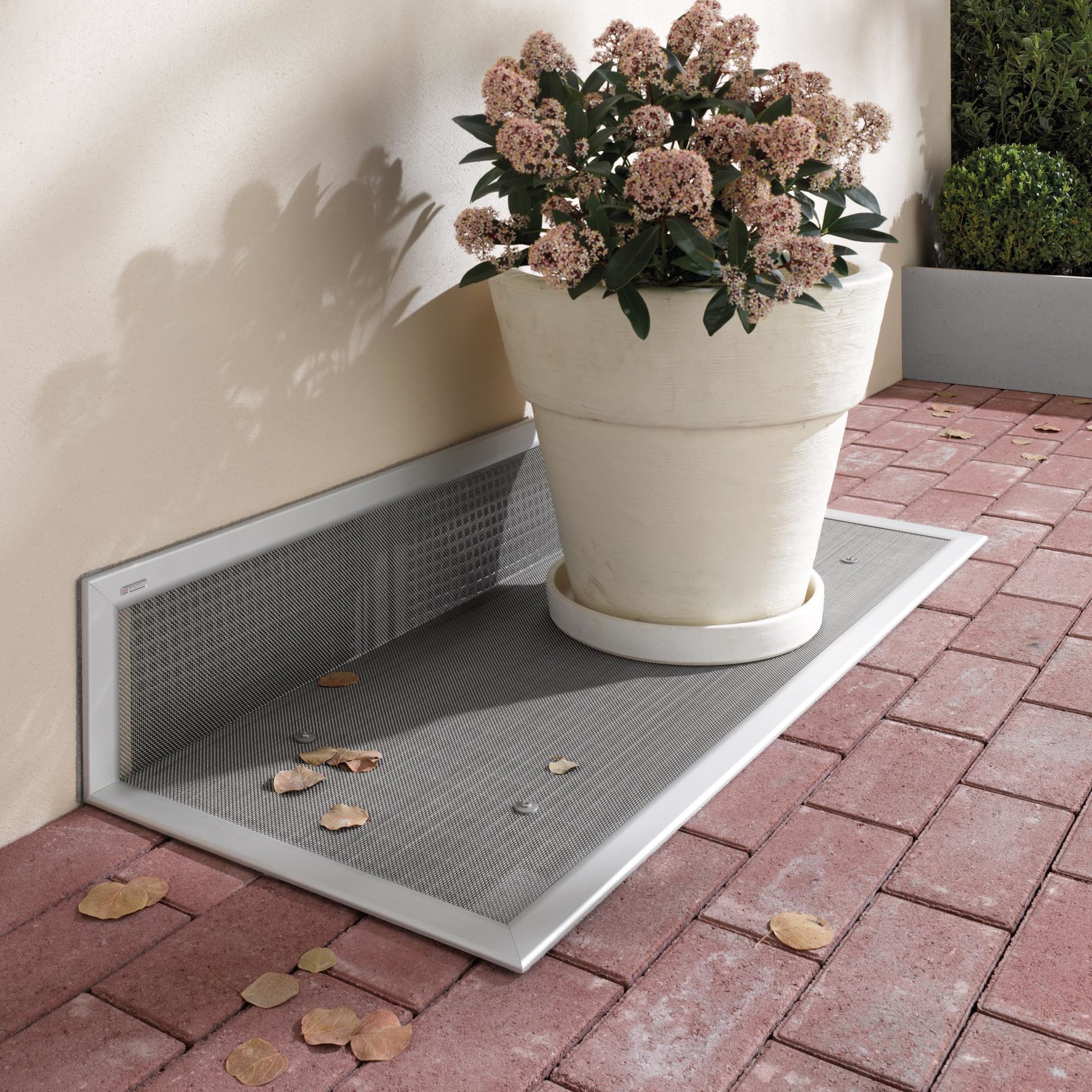 Lichtschachtabdeckungen mit Aufkantung schützen auch an Gewölbefenstern zuverlässig.